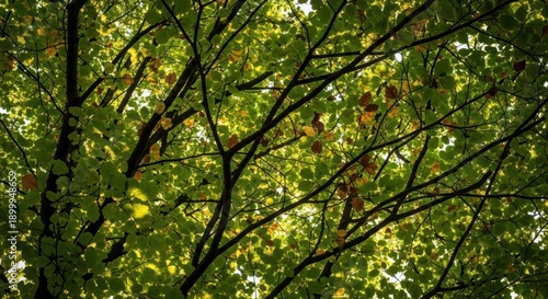 © Hungarian, Fototapeta premium Sunlight filters through a dense canopy of vibrant green tree leaves and dark branches overhead.
