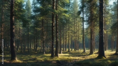 Obraz premium Sunlight filters through a dense coniferous forest