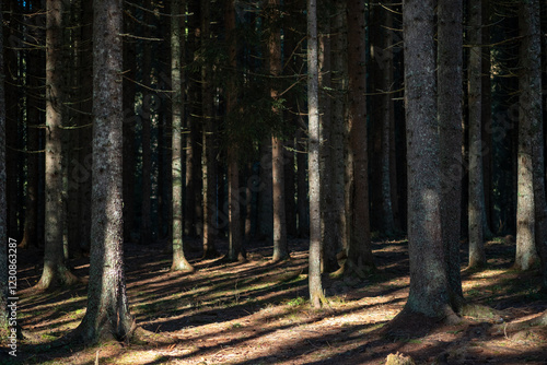 © Boragoo, Obraz premium Sunlight filters through a dense coniferous forest illuminating the tall tree trunks and casting long shadows on the forest floor