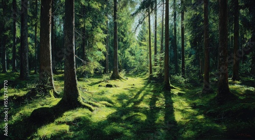 © Rahul, Fototapeta premium Sunlight filters through a dense forest