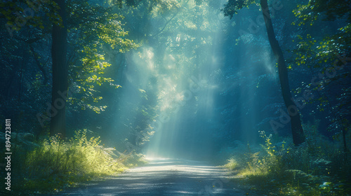© Janjira, Fototapeta premium Sunlight filters through a dense forest, casting ethereal beams of light onto a serene, moss-covered path, creating a tranquil and mystical atmosphere.