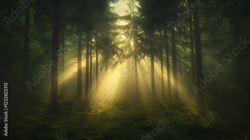 Naklejka premium Sunlight filters through a dense forest, creating a serene and mystical...