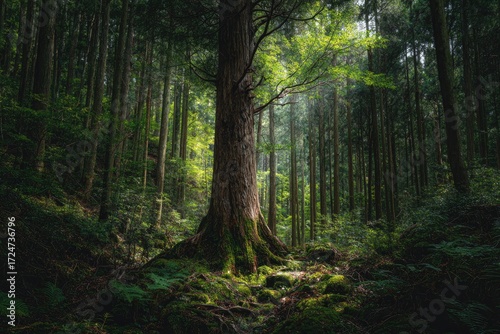 © Bahtiar, Naklejka premium Sunlight filters through a dense forest, highlighting a large, ancient tree