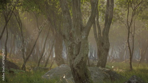 Fototapeta premium Sunlight filters through a dense forest, illuminating the mist that hangs low among trees. Rocks peeking through the foliage add texture to this tranquil woodland scene.
