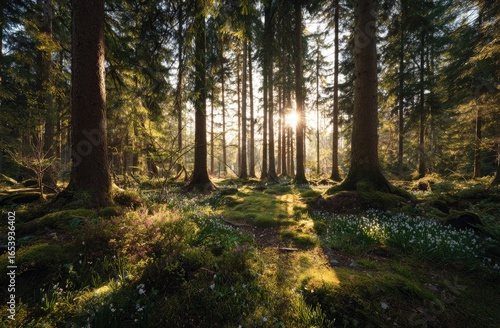 © Ramli, Fototapeta premium Sunlight filters through a dense forest, illuminating wildflowers