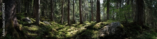 © NUSRAT ART, Fototapeta premium Sunlight filters through a dense forest of tall trees, illuminating mossy ground and rocks, creating a serene woodland scene perfect for nature and landscape themes.