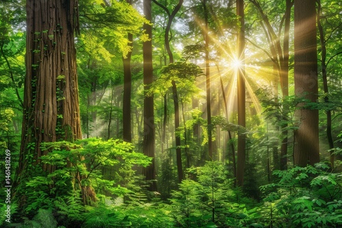 © kornc, Obraz premium Sunlight filters through a dense green forest.