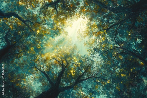 Obraz premium Sunlight filters through a lush canopy of trees, creating a magical, ethereal...