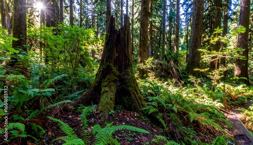 © Yakub, Fototapeta premium Sunlight filters through a lush forest floor, illuminating vibrant greenery and a decaying tree stump.