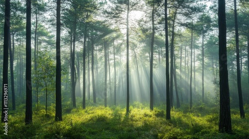 Obraz premium Sunlight filters through a lush forest in the early morning