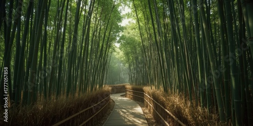© Saiyam, Obraz premium Sunlight filters through a lush green bamboo forest path with wooden railing