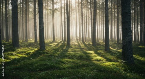 Obraz premium Sunlight filters through a misty pine forest. Shadows stretch across a bed of moss
