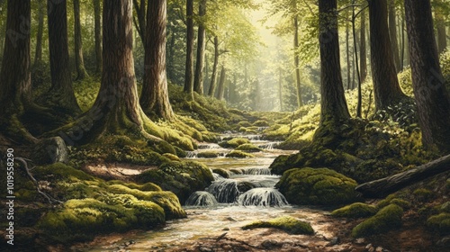 © Ali, Obraz premium Sunlight filters through a mossy forest.