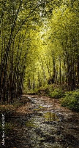 © Bintang, Fototapeta premium Sunlight filters through a vibrant bamboo forest path