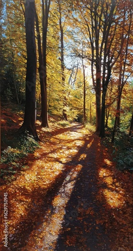 Naklejka premium Sunlight filters through autumn trees, casting long shadows on a forest path