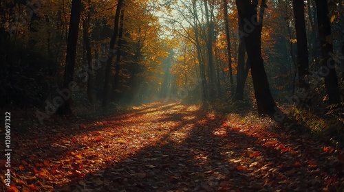 © tve-proneuro, Obraz premium Sunlight filters through autumn trees creating a golden pathway lined with fallen leaves in a tranquil forest during early evening hours