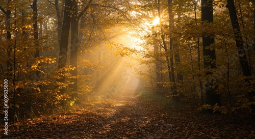 Obraz premium Sunlight filters through autumn trees onto a leafstrewn forest path
