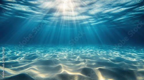 Fototapeta premium Sunlight filters through crystal clear water, illuminating the tranquil sandy ocean floor.