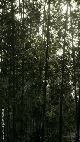Fototapeta premium Sunlight filters through dense bamboo forest, illuminating foliage and creating patterns on the ground, vertical