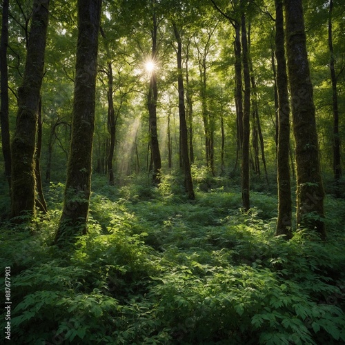 © Tamazina, Obraz premium Sunlight filters through dense forest canopy, casting dappled light on verdant underbrush below. Tall trees dominate scene, their thick trunks creating ethereal atmosphere.