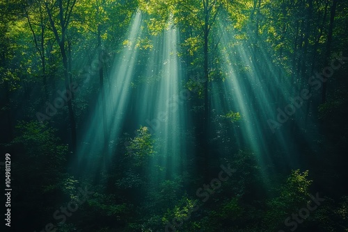 © Aekkachai, Fototapeta premium Sunlight filters through dense forest canopy, casting ethereal beams and illuminating lush greenery in a serene natural landscape.