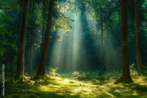 Fototapeta premium Sunlight filters through dense forest trees, creating a mystical aura as rays...