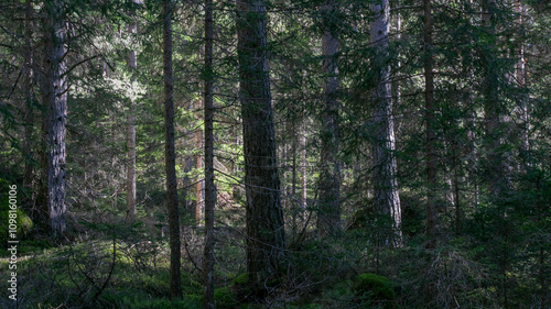 Fototapeta premium Sunlight filters through dense forest trees, creating a serene atmosphere...