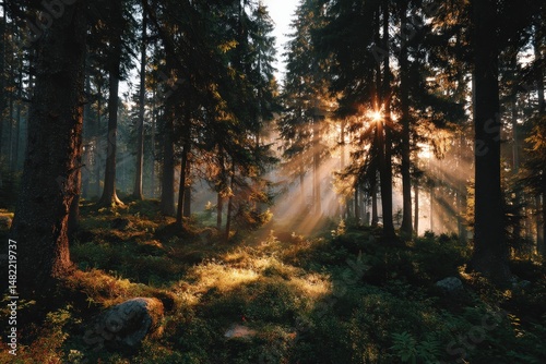 © UnderTheSun, Obraz premium Sunlight filters through dense forest trees in a serene landscape.