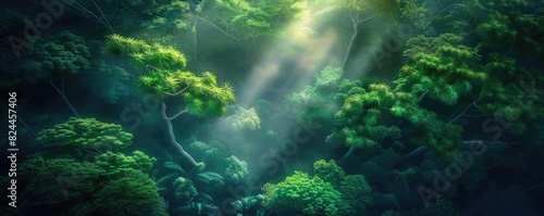 Fototapeta premium Sunlight filters through dense green forest canopy, creating a mystical and serene atmosphere in the lush jungle.