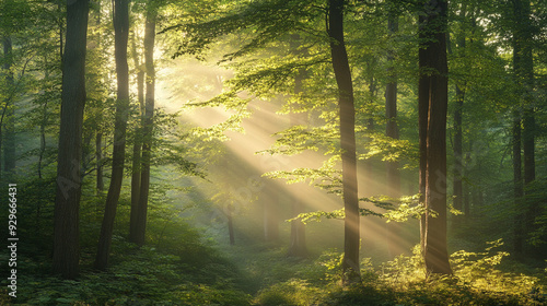 Fototapeta premium Sunlight filters through dense trees in a serene forest during early morning...