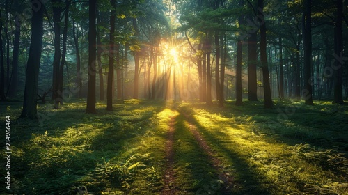 Fototapeta premium Sunlight filters through dense trees in a tranquil forest at sunrise