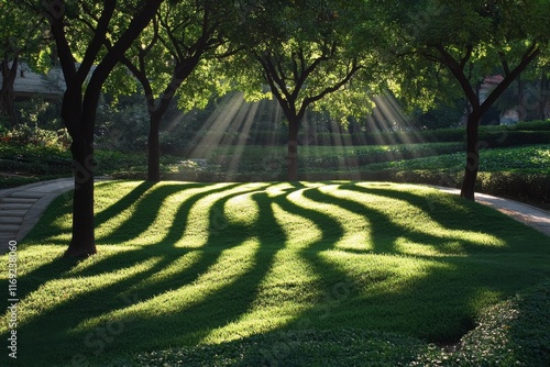 © ArtCookStudio, Obraz premium Sunlight filters through leaves creating beautiful patterns on stone pathway in a serene garden setting