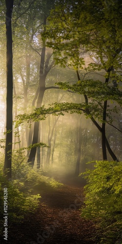 Obraz premium Sunlight filters through lush forest creating a serene and enchanting path in the morning mist.
