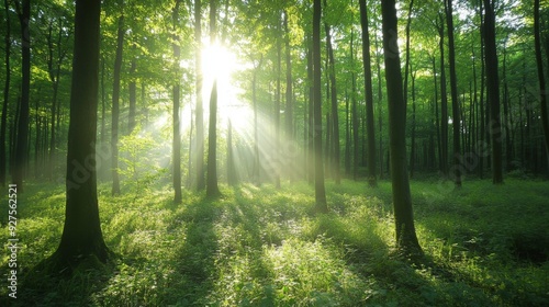Obraz premium Sunlight filters through lush green forest trees, casting serene rays and...