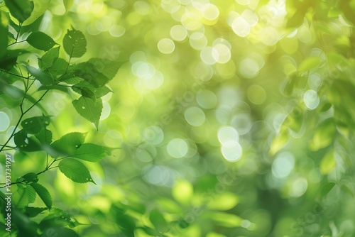 © Rayhanbp, Naklejka premium Sunlight filters through lush green leaves creating a bokeh effect and serene mood