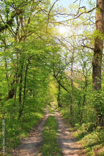 Fototapeta premium Sunlight filters through lush green trees onto a winding dirt road in a forest