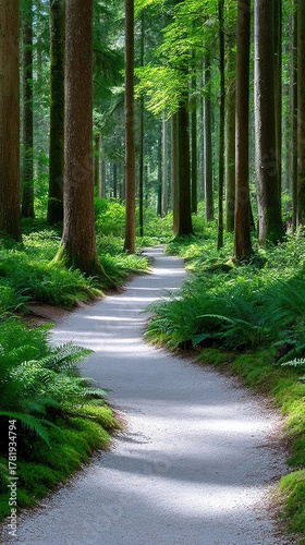 © ilfa, Fototapeta premium Sunlight filters through lush green trees onto a winding white gravel path through a dense forest creating dappled shadows and a serene natural landscape