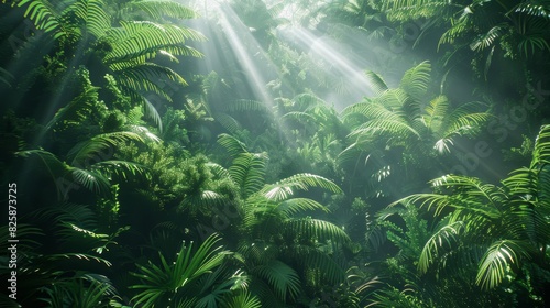 Obraz premium Sunlight filters through lush green tropical rainforest foliage, creating a...