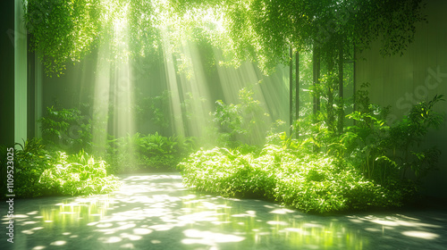 Obraz premium Sunlight filters through lush greenery in a serene indoor garden space....