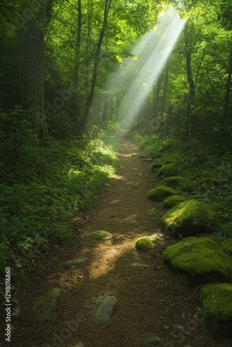 Obraz premium Sunlight filters through lush trees, illuminating tranquil fores