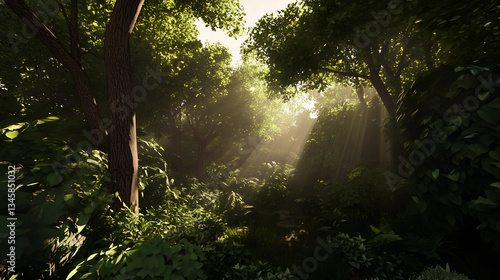 Obraz premium Sunlight filters through lush trees in a serene forest during early morning...