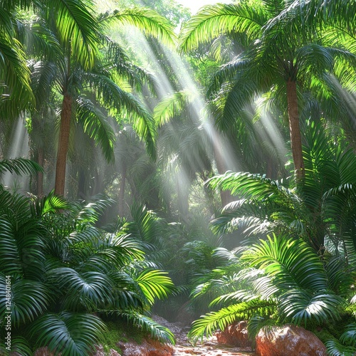© Inkreatif, Fototapeta premium Sunlight Filters Through Lush Tropical Palms