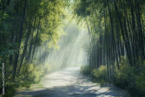 Fototapeta premium Sunlight filters through tall bamboo trees in a peaceful forest pathway
