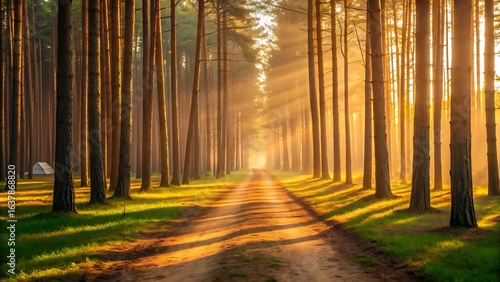 © Habib, Obraz premium Sunlight filters through tall pine trees lining a forest path