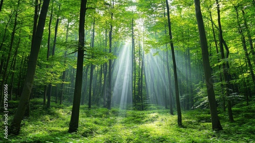 © pvl0707, Obraz premium Sunlight filters through tall trees creating a serene atmosphere in a lush green forest during midday