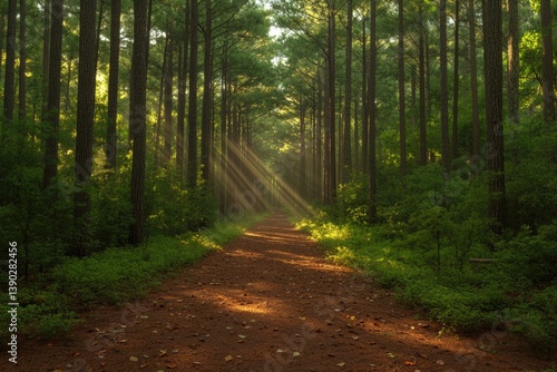 © Nikolai, Obraz premium Sunlight filters through tall trees, illuminating serene forest