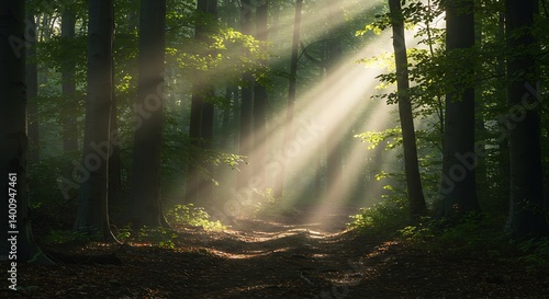© NEUVANJOSE, Obraz premium Sunlight filters through tall trees in a serene forest, creating a magical atmosphere along a winding path with soft light shafts.