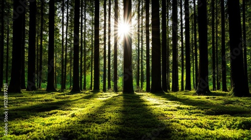 Obraz premium Sunlight filters through tall trees in a serene forest, creating a peaceful...