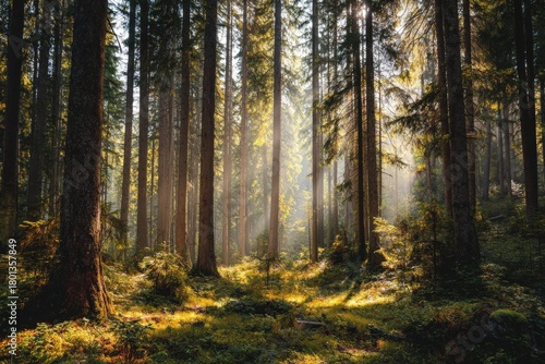 Obraz premium Sunlight filters through tall trees in a serene forest, illuminating the lush...