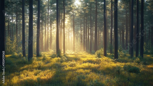 Fototapeta premium Sunlight filters through tall trees in a serene forest, illuminating the...